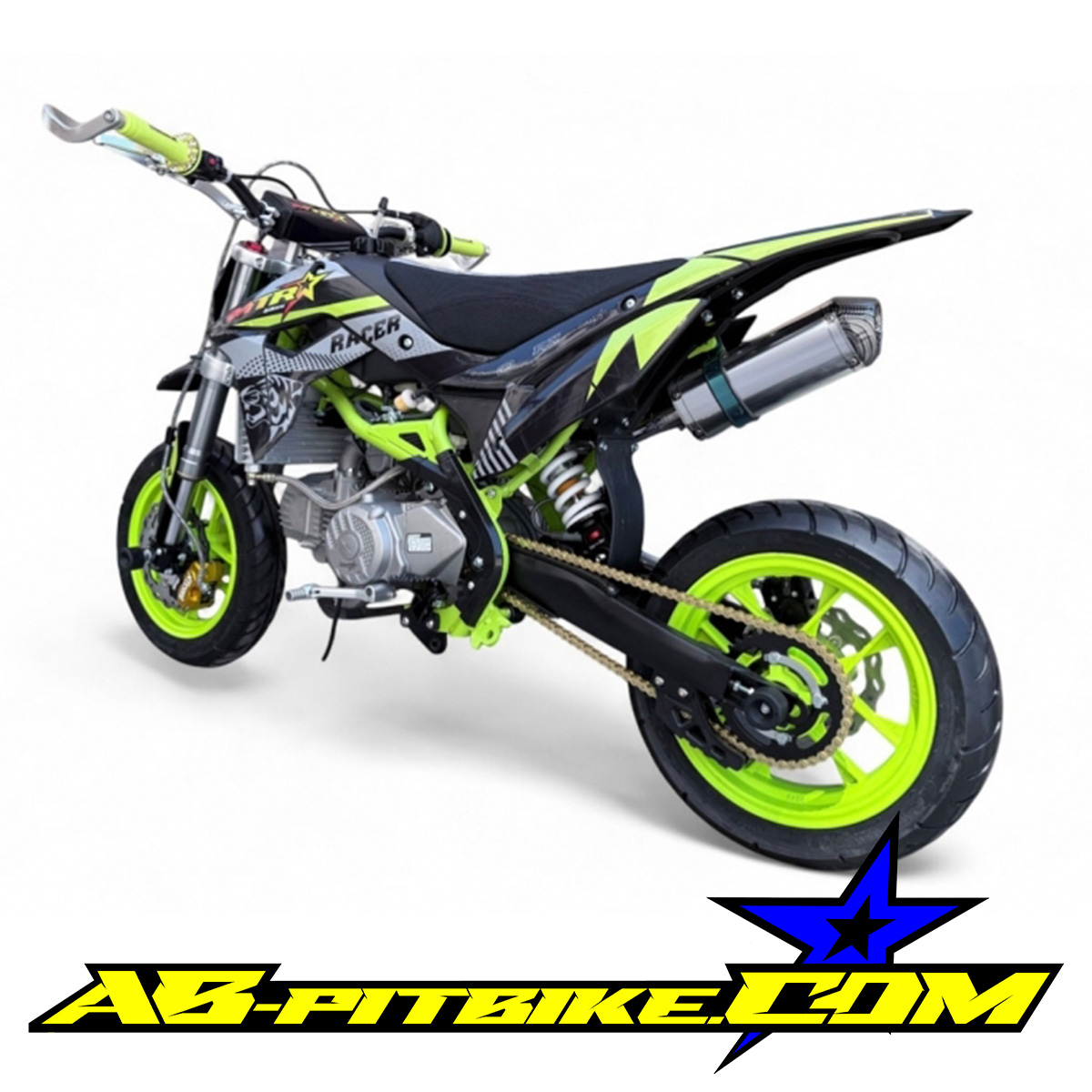 Die Racer zeigt ein gewagtes und aggressives Design. Das abgesenkte Heckrahmen und die extra lange 440mm Schwinge ermöglichen eine ganz neue Sitzposition, hierdurch ergeben sich ganz andere Trainingsmöglichkeiten als mit einem herkömmlichen Pitbike!